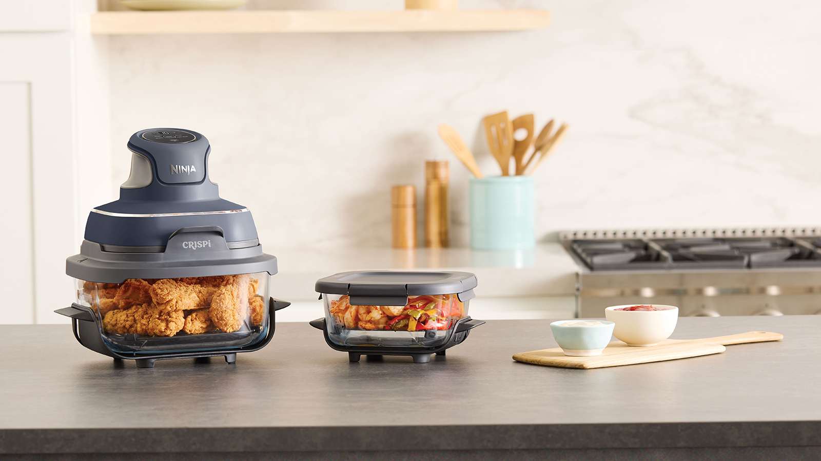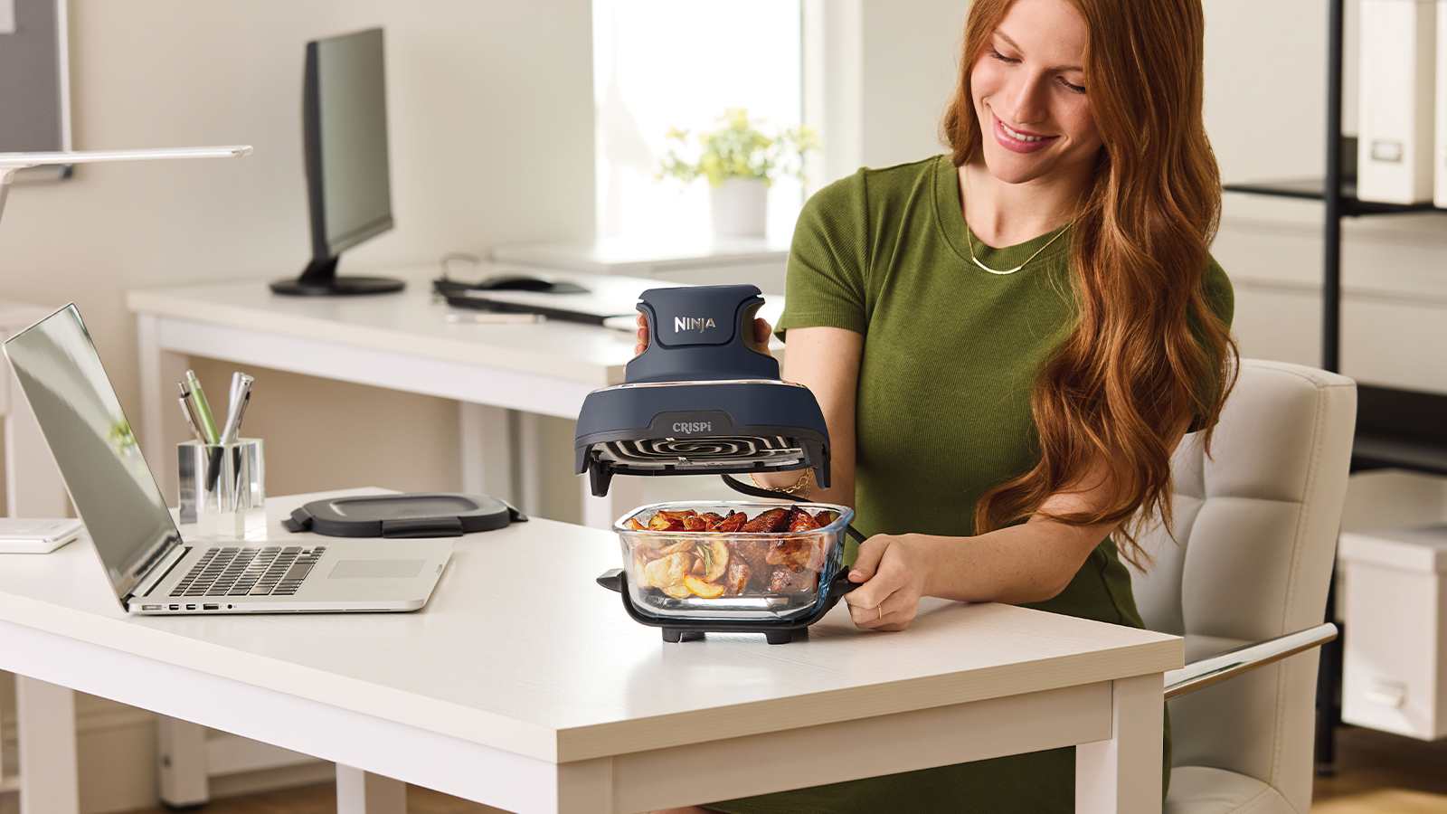 Meet the Ninja CRISPi —our revolutionary 4-in-1 portable glass air fryer cooking system that delivers the power of a full-sized air fryer in a sleek, compact design. Whether you're at home, in the office, or on the road, CRISPi makes it easy to enjoy your favourite meals wherever life takes you. With its ultra-portable build and lightweight 1700-watt PowerPod, you can snap it onto one of the included glass containers to whip up everything from family-sized feasts to solo snacks.