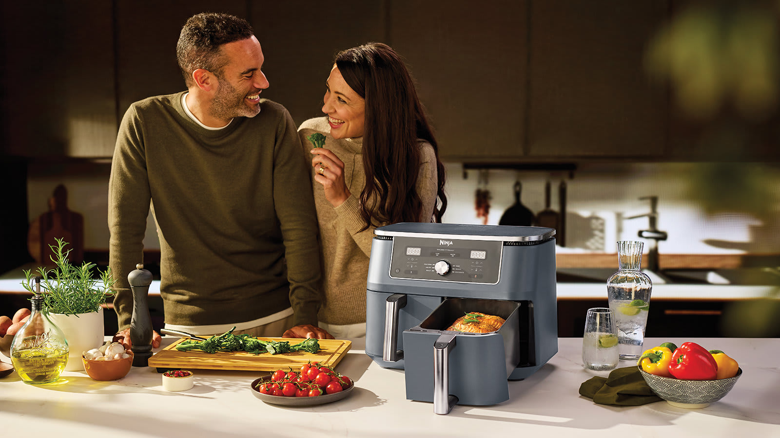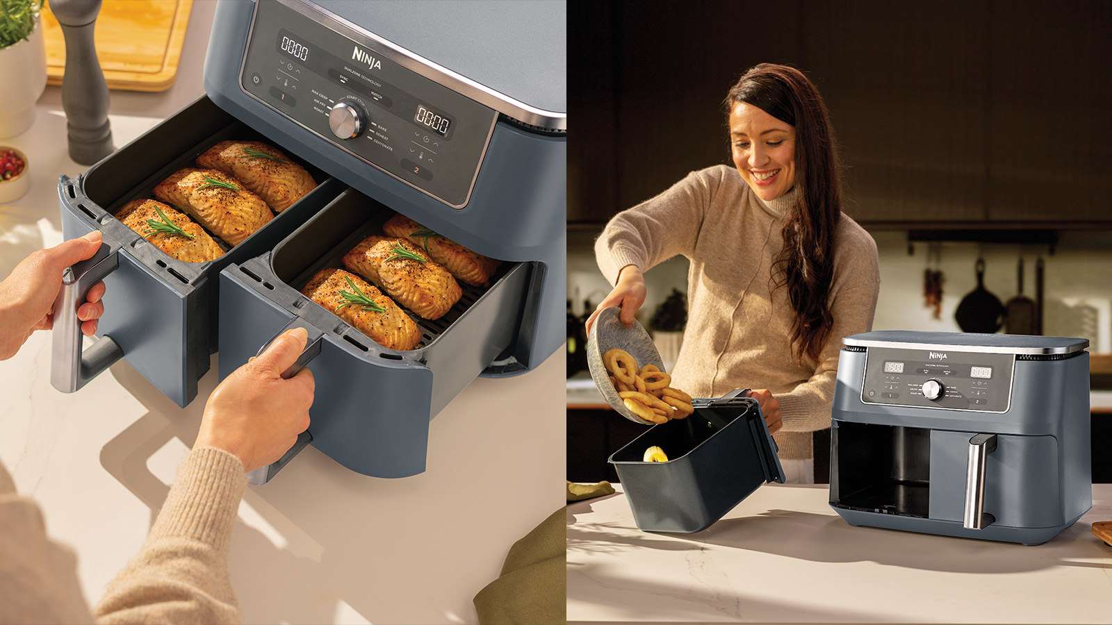 Dual Zone cooking just got a brand new look. Meet the large capacity air fryer that cooks 2 foods, 2 ways, and finishes at the same time.