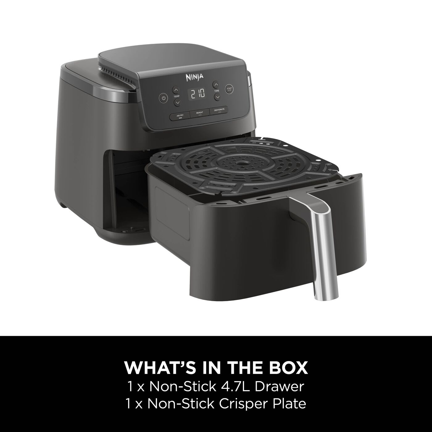 Large capacity, small footprint: The 4.7L drawer is perfect for feeding up to 2 people, or just cook enough for 1, without taking up precious space on your worktop. A removable crisper plate ensures air circulates evenly around your food for 360° crisping.