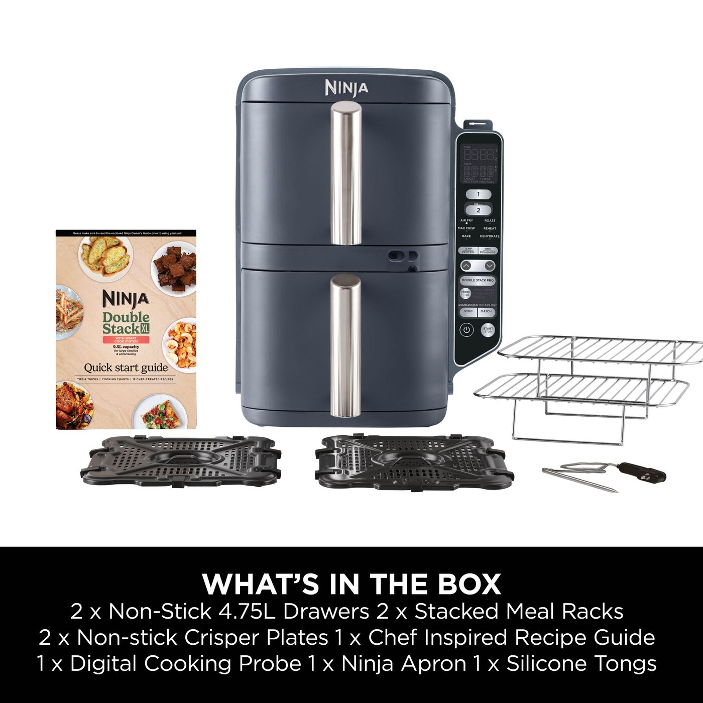 - Includes Apron, Tongs, 2x non-stick, dishwasher-safe 4.75L drawers & crisper plates, 2x stainless steel racks, Digital Cooking Probe, Recipe Guide